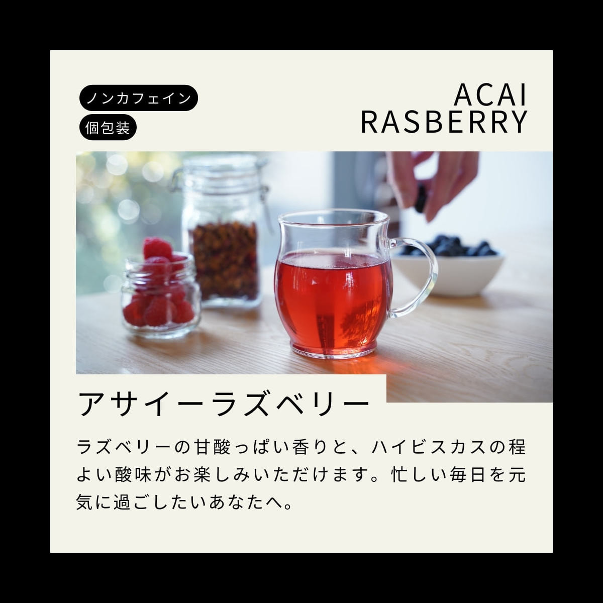 ハイビスカス、アップル、ブラックベリーリーフ、ローズヒップ、オレンジピール、アサイーパウダー/香料、クエン酸